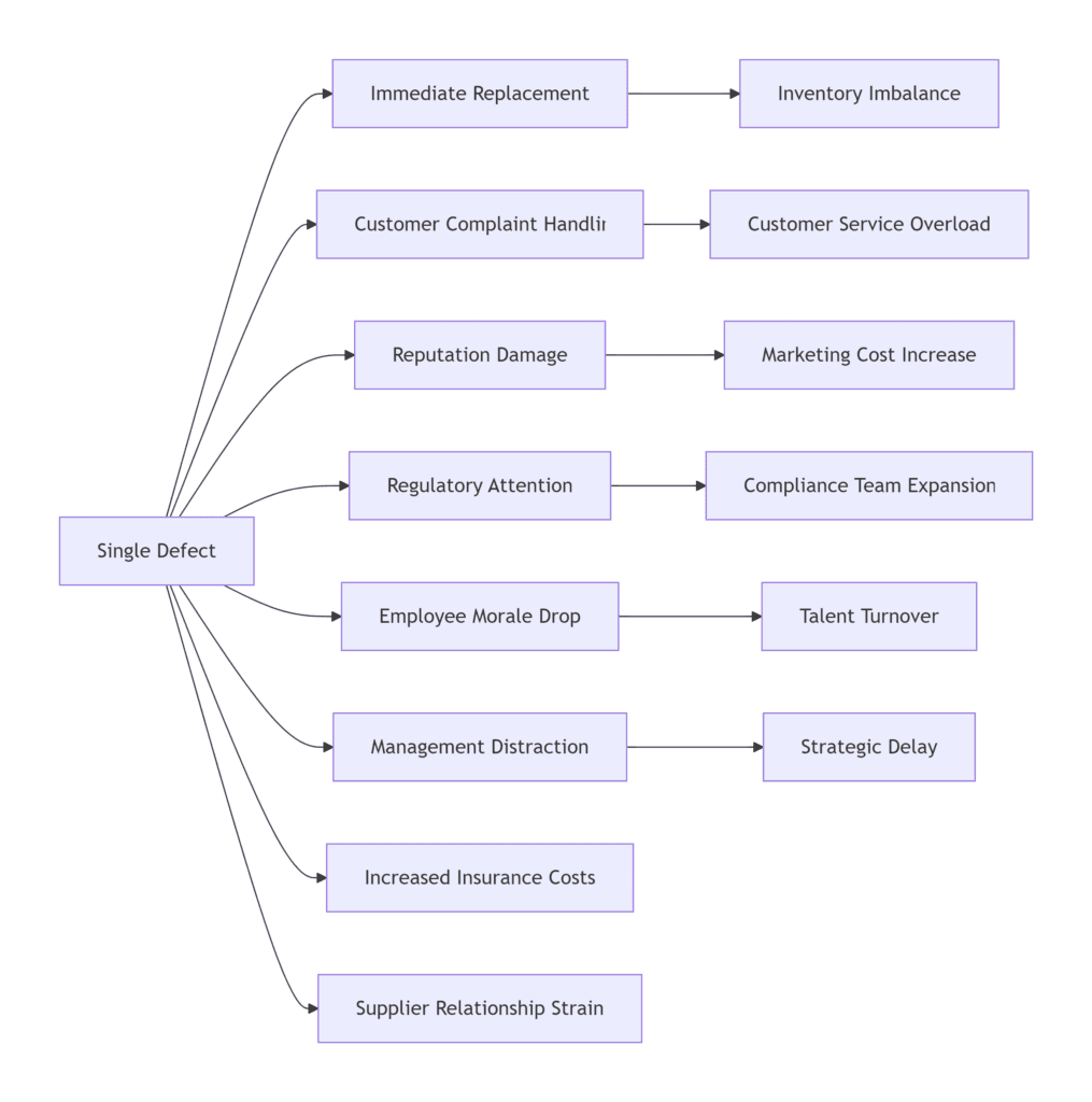 رسم بياني يوضح كيف يؤدي عيب واحد إلى: 1. استبدال فوري 2. معالجة شكوى العميل 3. تلف السمعة 4. انتباه تنظيمي 5. انخفاض معنويات الموظفين 6. تشتيت الإدارة 7. زيادة تكاليف التأمين 8. إجهاد علاقة الموردين